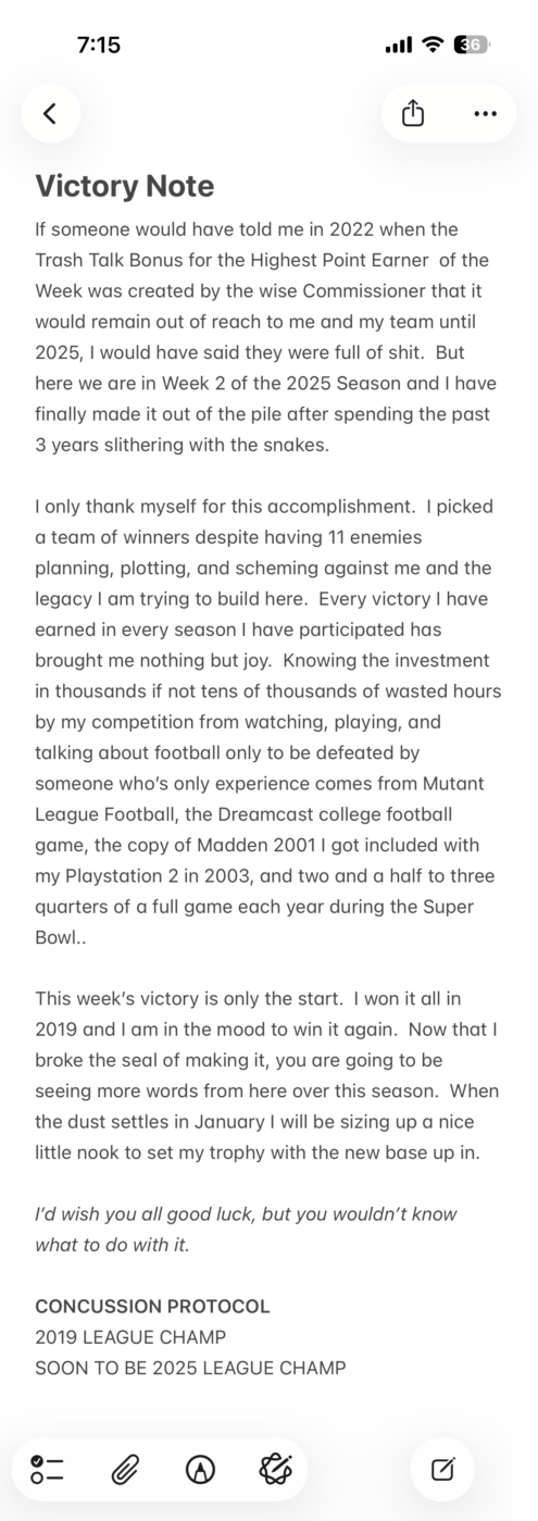 If someone would have told me in 2022 when the Trash Talk Bonus for the Highest Point Earner of the Week was created by the wise Commissioner that it would remain out of reach to me and my team until 2025, I would have said they were full of shit. But here we are in Week 2 of the 2025 Season and I have finally made it out of the pile after spending the past 3 years slithering with the snakes.