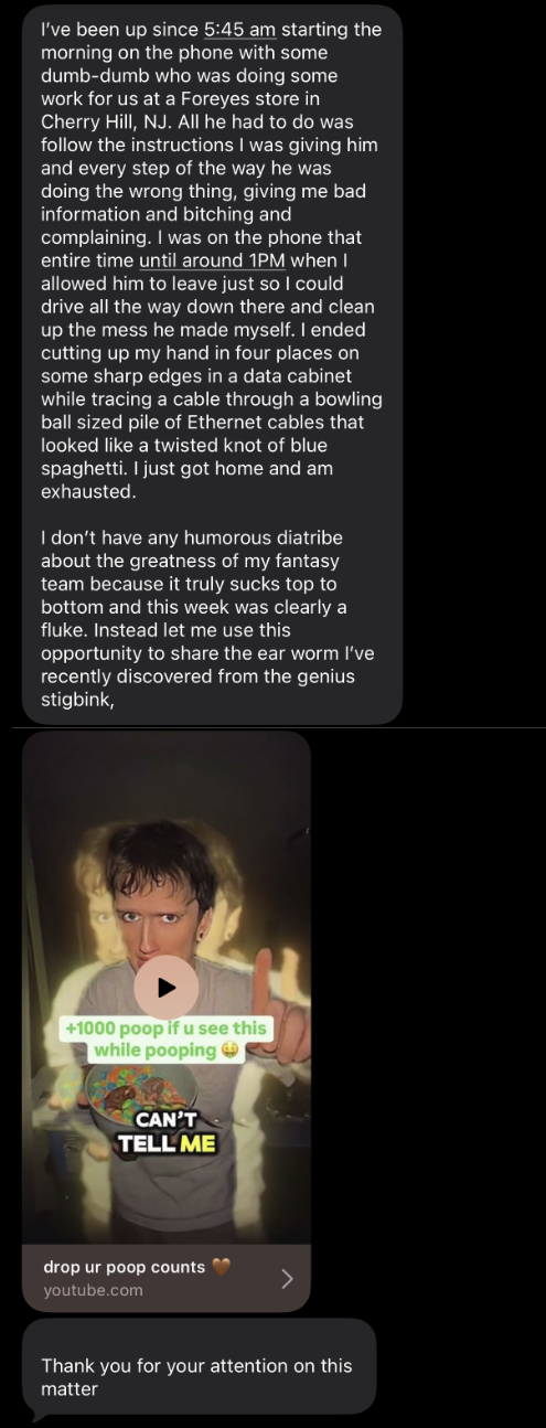 I’ve been up since 5:45 am starting the morning on the phone with some dumb-dumb who was doing some work for us at a Foreyes store in Cherry Hill, NJ. All he had to do was follow the instructions I was giving him and every step of the way he was doing the wrong thing, giving me bad information and bitching and complaining. I was on the phone that entire time until around 1PM when I allowed him to leave just so I could drive all the way down there and clean up the mess he made myself. I ended cutting up my hand in four places on some sharp edges in a data cabinet while tracing a cable through a bowling ball sized pile of Ethernet cables that looked like a twisted knot of blue spaghetti. I just got home and am exhausted. I don’t have any humorous diatribe about the greatness of my fantasy team because it truly sucks top to bottom and this week was clearly a fluke. Instead let me use this opportunity to share the ear worm I’ve recently discovered from the genius stigbink, Thank you for your attention on this matter |