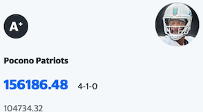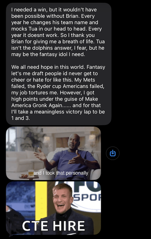 I needed a win, but it wouldn't have been possible without Brian. Every year he changes his team name and mocks Tua in our head to head. Every year it doesnt work. So I thank you Brian for giving me a breath of life. Tua isn't the dolphins answer, I fear, but he may be the fantasy idol I need. We all need hope in this world. Fantasy let's me draft people id never get to cheer or hate for like this. My Mets failed, the Ryder cup Americans failed, my job tortures me. However, I got high points under the guise of Make America Gronk Again...... and for that I'll take a meaningless victory lap to be 1 and 3. |