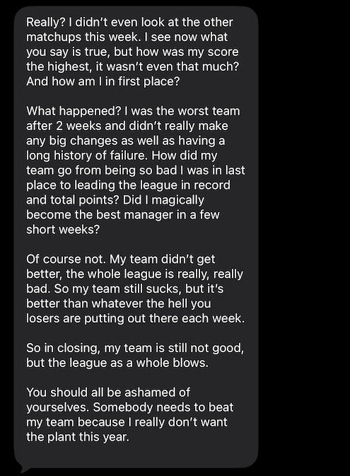 Really? I didn’t even look at the other matchups this week. I see now what you say is true, but how was my score the highest, it wasn’t even that much? And how am I in first place? What happened? I was the worst team after 2 weeks and didn’t really make any big changes as well as having a long history of failure. How did my team go from being so bad I was in last place to leading the league in record and total points? Did I magically become the best manager in a few short weeks? Of course not. My team didn’t get better, the whole league is really, really bad. So my team still sucks, but it’s better than whatever the hell you losers are putting out there each week. So in closing, my team is still not good, but the league as a whole blows. You should all be ashamed of yourselves. Somebody needs to beat my team because I really don’t want the plant this year. No Image Provided |